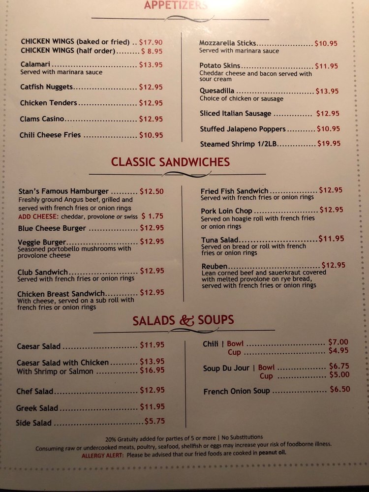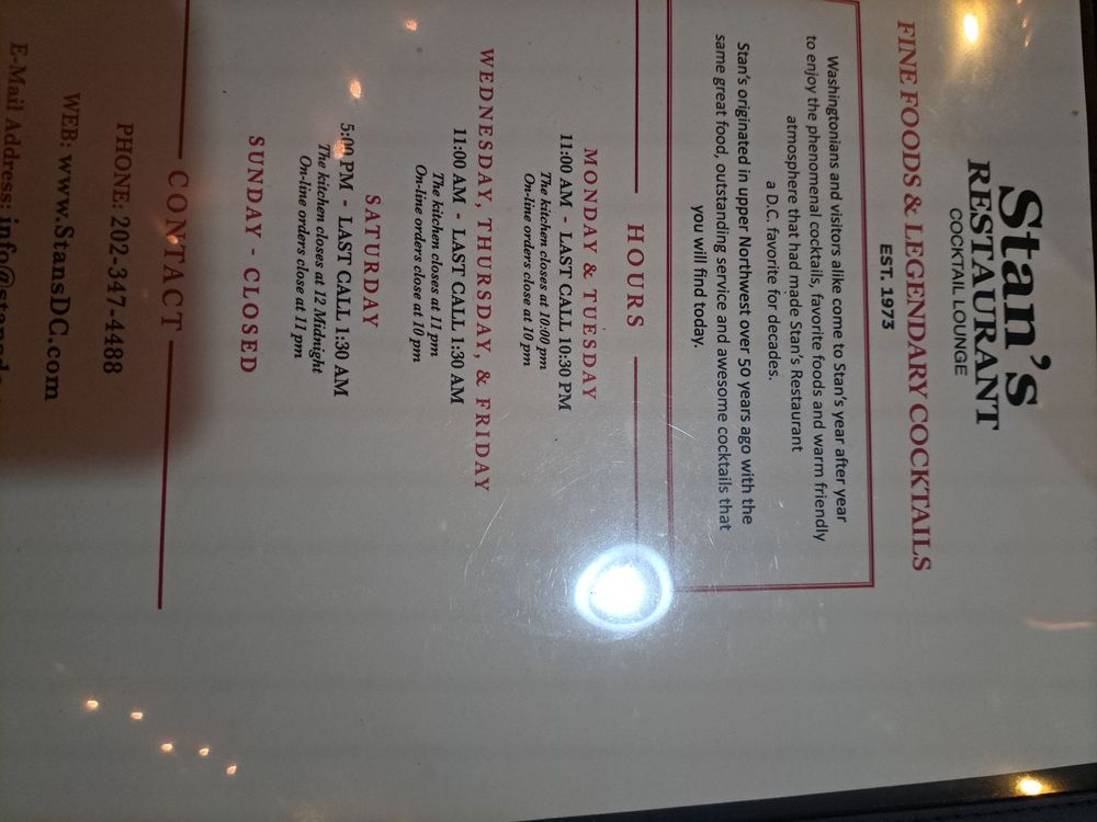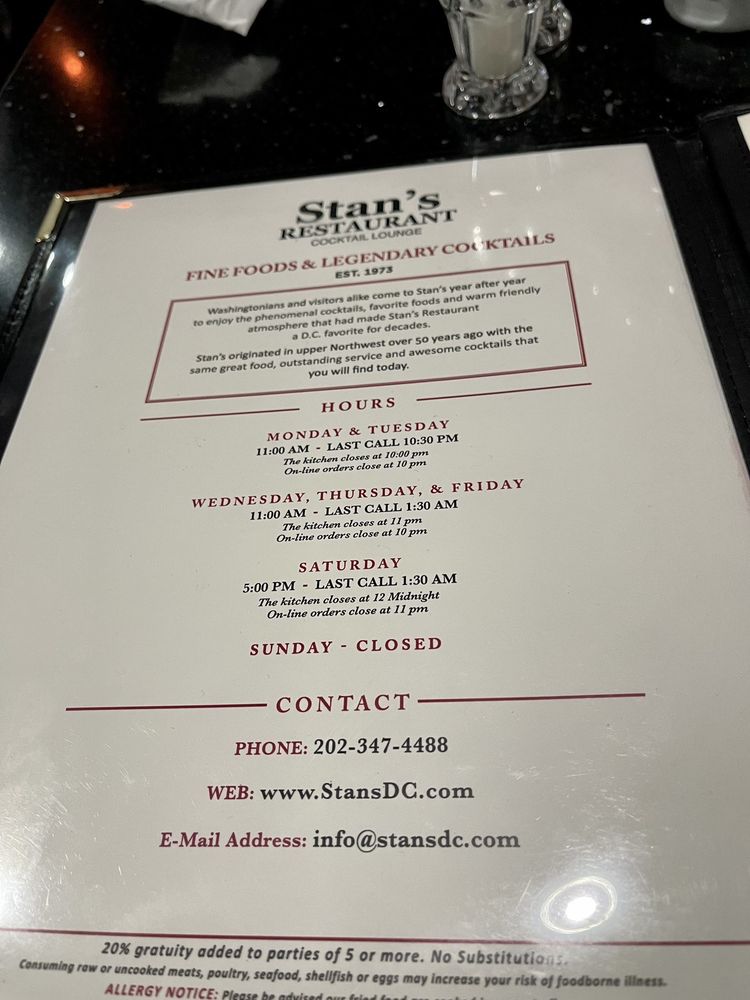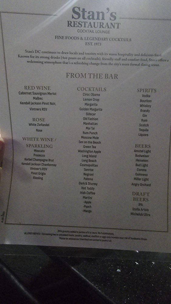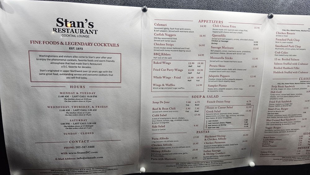 Step into the vibrant atmosphere of Stan's Restaurant & Bar located in Washington, DC. This hotspot offers a variety of options like delivery, takeout, and reservations with a menu filled with flavorful dishes. From 1 lb Steamed Shrimp to Stuffed Jalapeno Poppers, the appetizers are a great start. Dive into refreshing salads like Caesar Salad or hearty sandwiches like the Club Sandwich. Customer reviews rave about the strong drinks, generous portions, and flavorful wings. Stan's Restaurant & Bar is a gem in the DC dining scene, with a lively ambiance perfect for gatherings and late-night outings. Don't miss out on their signature dishes and well-crafted cocktails that are sure to impress your taste buds. Visit Stan's Restaurant & Bar for a true culinary experience that you won't forget.